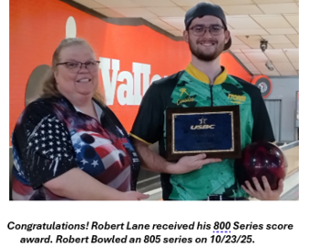 The Anthracite Valley USBC Association presented John Mitchell with his 300 Game and 800 Series awards on February 8th. John bowled both games on Dec. 21, 2024. Congratulations, John. Great bowling!